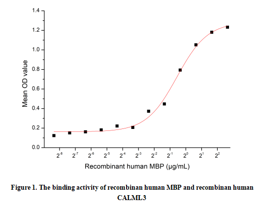 Myelin basic protein (MBP), a 18.5-kDa encephalitogenic peptide, is the second most abundant in central nervous system and responsible for adhesion of the cytosolic surfaces of multilayered compact myelin, MBP is biased expressed in cerebellum adult and cortex adult. It can interact with a number of polyanionic proteins including actin, tubulin, Ca(2 )-calmodulin, and clathrin, and negatively charged lipids, and acquires structure on binding to them. Calmodulin Like Protein 3 (CALML3) is a kind of Ca(2 )-calmodulin, thus a functional binding ELISA assay was conducted to detect the interaction of recombinant human MBP and recombinant human CALML3.Briefly, MBP was diluted serially in PBS with 0.01% BSA (pH 7.4). Duplicate samples of 100 μl were then transferred to CALML3-coated microtiter wells and incubated for 1h at 37℃. Wells were washed with PBST and incubated for 1h with anti-MBP pAb, then aspirated and washed 3 times. After incubation with HRP labelled secondary antibody for 1h at 37℃, wells were aspirated and washed 5 times. With the addition of substrate solution, wells were incubated 15-25 minutes at 37℃. Finally, add 50 μL stop solution to the wells and read at 450/630nm immediately. The binding activity of ecombinant human MBP and recombinant human CALML3 was shown in Figure 1, the EC50?for this effect is 0.081μg/mL..