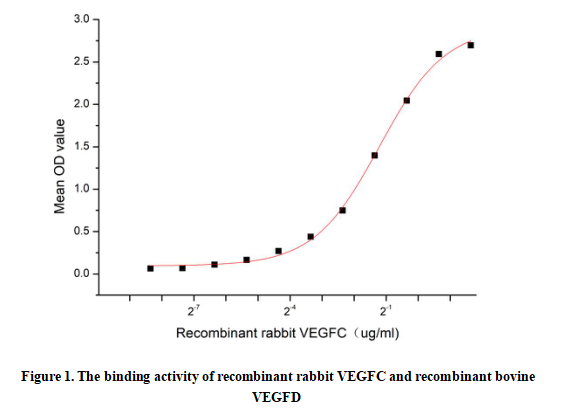 Vascular Endothelial Growth Factor C (VEGFC) is a key lymphangiogenic factor that primarily binds to VEGFR-3 (FLT4), promoting lymphatic endothelial cell proliferation, migration, and survival. It also activates VEGFR-2 (KDR) upon proteolytic processing, contributing to angiogenesis. VEGFC is essential for embryonic lymphatic development and adult lymphatic remodeling.Besides,Vascular Endothelial Growth Factor D (VEGFD) has been identified as an interactor of VEGFC, thus a functional binding ELISA assay was conducted to detect the interaction of recombinant rabbit VEGFC and recombinant bovine VEGFD . Briefly, biotin-linked VEGFC were diluted serially in PBS, with 0.01% BSA (pH 7.4). Duplicate samples of 100μl were then transferred to VEGFD-coated microtiter wells and incubated for 1h at 37℃. Wells were washed with PBST 3 times and incubation with Streptavidin-HRP for 30min, then wells were aspirated and washed 5 times. With the addition of substrate solution, wells were incubated 15-25 minutes at 37℃. Finally, add 50μl stop solution to the wells and read at 450nm immediately. The binding activity of recombinant rabbit VEGFC and recombinant bovine VEGFD was shown in Figure 1, the EC50?for this effect is 0.43ug/mL.